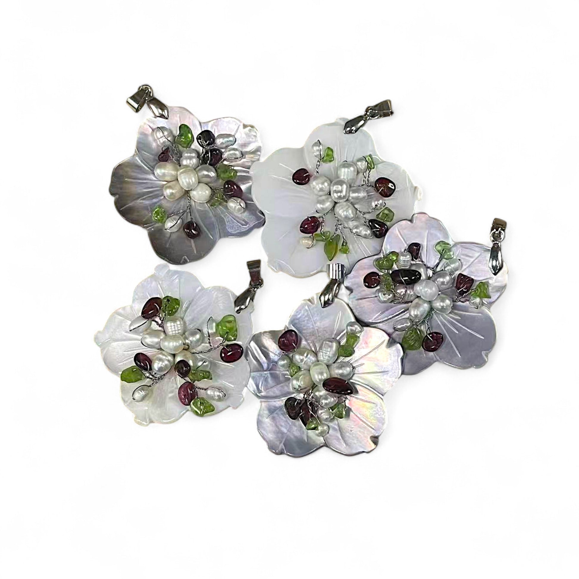 Pearl Flower shape Pendant, w/ wrapped potato Freshwater pearl, Garnet & Peridot Nuggets