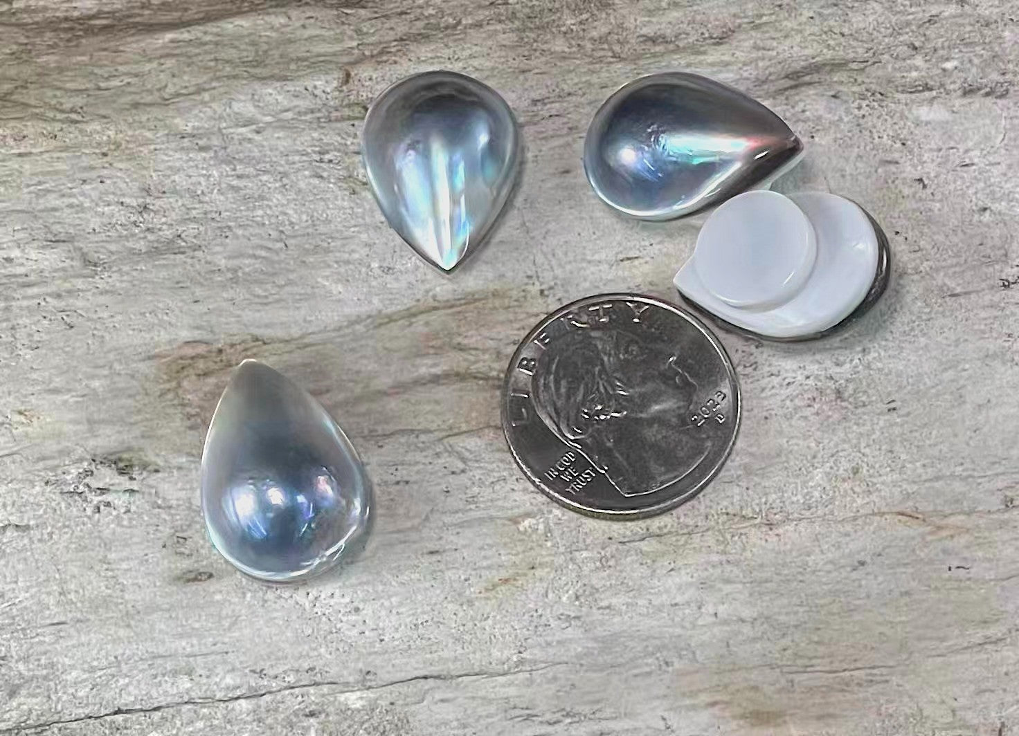 Mabe Pearls are produced in saltwater oysters in the regions of Japan, Indonesia, Australia and French Polynesia. It may take anywhere from two to six years for each pearl's production, depending on the desired size. Once the Mabe Pearl has developed, workers cut the pearl out of the shell with a circle-bit drill.